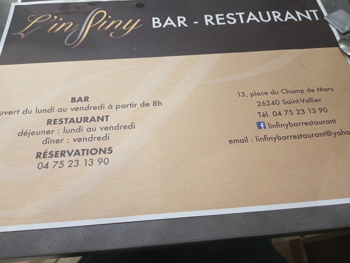 Welcome to L'infiny, a culinary gem located at 13 Pl. du Champ de Mars in the heart of Saint-Vallier, France. This delightful establishment has quickly become a favored spot for both locals and visitors, offering a warm, vibrant atmosphere that beckons all food lovers.